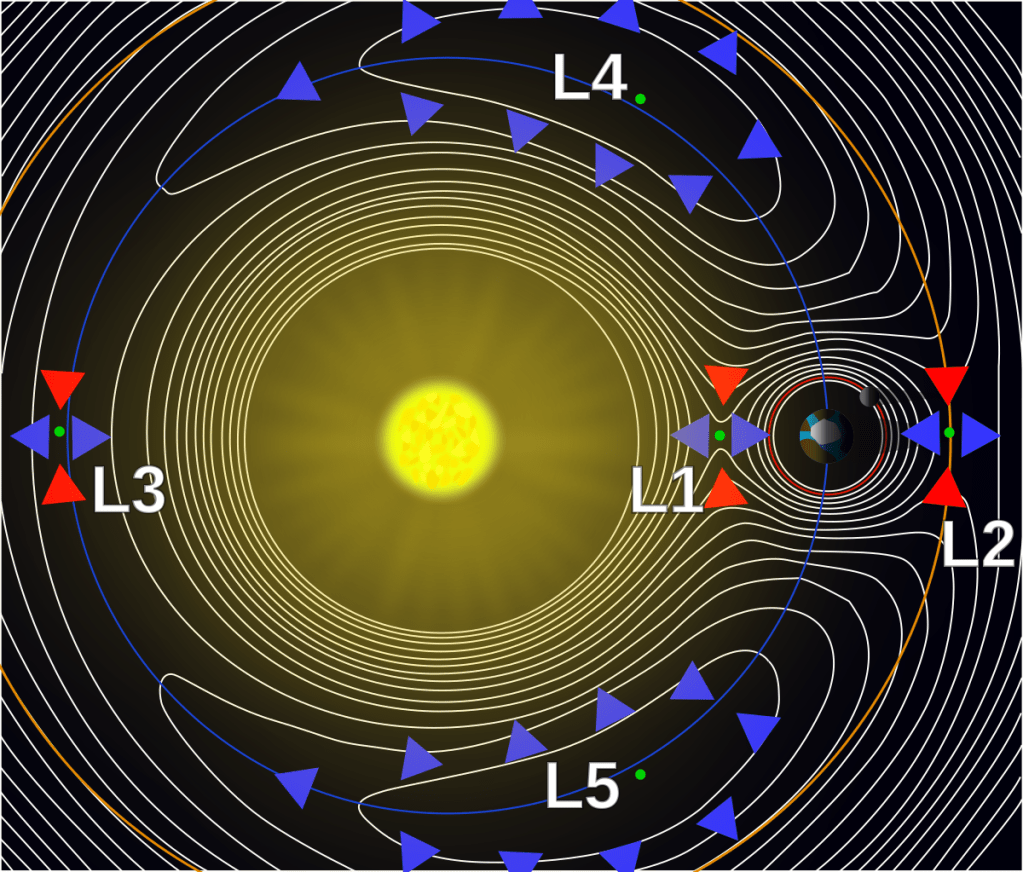 സൂര്യനും ഭൂമിയും പരസ്പരാകർഷണത്തിൽ കഴിയുന്ന പിണ്ഡങ്ങളായതിനാൽ, അവയുടെ ഇക്വിപ്പൊട്ടെൻഷ്യൽ സർഫസുകൾ ഓവർലാപ്പ് ചെയ്യുന്നതു് സ്വാഭാവികം. ആകർഷണത്തിനോടൊപ്പംതന്നെ, സൂര്യന്റെ ഉള്ളിലായി സ്ഥിതിചെയ്യുന്ന പൊതുവായ ഒരു ഗുരുത്വബിന്ദു കേന്ദ്രമാക്കിയുള്ള ഭ്രമണം മൂലം, അതുവഴിയുള്ള സെൻട്രിഫ്യൂഗൽ പൊട്ടൻഷ്യലും ഈ ഓവർലാപ്പിങ്ങിൽ അതിന്റേതായ പങ്കു് വഹിക്കുന്നുണ്ടു്. അങ്ങനെ, വിവിധ പൊട്ടൻഷ്യലുകൾ ഓവർലാപ്പ് ചെയ്യുന്നതുവഴി രൂപമെടുക്കുന്ന ചില പ്രത്യേക പോയിന്റുകൾ സന്തുലിതാവസ്ഥയിൽ (equilibrium) ആയിരിക്കും. ഇക്വിലിബ്രിയം മൂലം സവിശേഷമായ സ്ഥിരത പ്രദർശിപ്പിക്കുന്ന അഞ്ചു് ഇടങ്ങളാണു് – ചിത്രത്തിൽ കാണാൻ കഴിയുന്നതുപോലെ, – L1 മുതൽ L5 വരെയുള്ള ലാഗ്രാഞ്ജിയൻ പോയിന്റ്സ്. ഗണിതശാസ്ത്രജ്ഞനും ജ്യോതിശ്ശാസ്ത്രജ്ഞനുമായിരുന്ന Joseph-Louis Lagrange-നോടുള്ള ബഹുമാനാർത്ഥം ഈ പേരു്. ഉയർന്ന പിണ്ഡമുള്ള, പരസ്പരാകർഷണത്തിൽ ഭ്രമണപഥങ്ങളിൽ ചലിക്കുന്ന രണ്ടു് വാനഗോളങ്ങളുടെ സ്വാധീനത്തിൽ, വളരെ ചെറിയ പിണ്ഡമുള്ള സാറ്റലൈറ്റ് പോലുള്ള വസ്തുക്കൾക്കു് സന്തുലിതാവസ്ഥയിൽ (equilibrium) സ്ഥിതിചെയ്യാനാവും. – (restricted three-body problem).