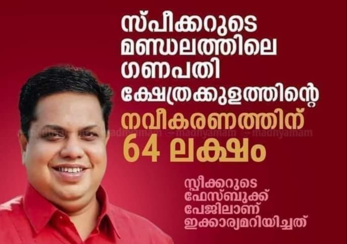 ഒരു മിത്തായ ഗണപതിയുടെ ക്ഷേത്രക്കുളത്തിന്റെ നവീകരണത്തിനു് 64 ലച്ചം രൂഫാ നൽകിയ ജനാബ് സ്പീക്കർ ഷംസീർ സഖാവിനെ ടിപ്പുവിനോടു് ഉപമിച്ചു് യുവമോർച്ച സംസ്ഥാനാദ്ധ്യക്ഷൻ.