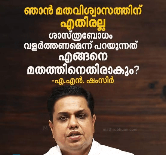 ശാസ്ത്രബോധം വളർത്താൻ, “ആനത്തലയൻ” ഗണപതിയെയോ, “ഭൂമി-സ്വർഗ്ഗം വൺ നൈറ്റ് റൗണ്ട് ട്രിപ്പ് ടാക്സി സർവ്വീസ്” ബുറാഖിനെയോ, “സ്വർഗ്ഗാരോഹകൻ” യേശുവിനെയോ, മതങ്ങൾ ഘോഷിക്കുന്ന മറ്റിനം “ശാസ്ത്രസത്യങ്ങളെയോ” കൂട്ടുപിടിക്കേണ്ട ആവശ്യം, മതിയായ ശാസ്ത്രജ്ഞാനം ഉള്ള ആർക്കുമില്ല. ആ ശാസ്ത്രജ്ഞാനം ഇല്ലാത്തതിനാലാണു്, സ്പീക്കറായിട്ടും ജനാബ് സഖാവു് ഷംസീർ കേവലമൊരു “ഷംസീർ” മാത്രമായിരിക്കുന്നതും, ഓരോരോ വിടുവായത്തങ്ങൾ ലോകമദ്ധ്യേ വിളിച്ചു പറയുന്നതും!