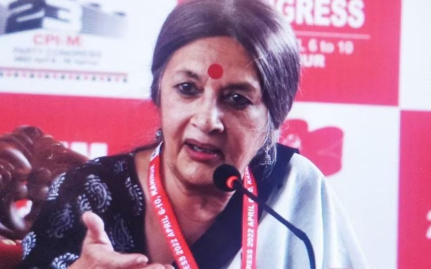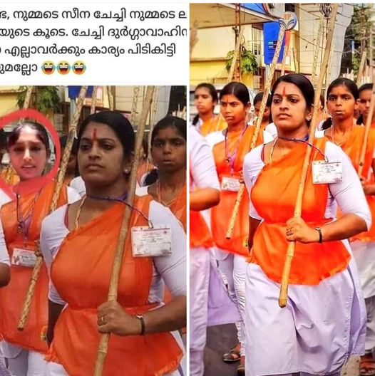 ഒറ്റനോട്ടത്തിൽ, ചോരച്ചാൽ നീന്തിക്കയറുന്ന പിണറായിസ്റ്റ് ചോപ്പൻ വാൾ-അണ്ടിയേഴ്സിനെ അരിവാളേന്തി, കവാത്തുനടത്തി, ധീരതയോടെ നയിക്കുന്ന “നരകമാതാവാണെന്നു്” തോന്നി. ഒന്നുകൂടി നോക്കിയപ്പോൾ ആ തോന്നൽ ശരിയായിരുന്നു എന്നു് ബോദ്ധ്യമായി. ![]()
