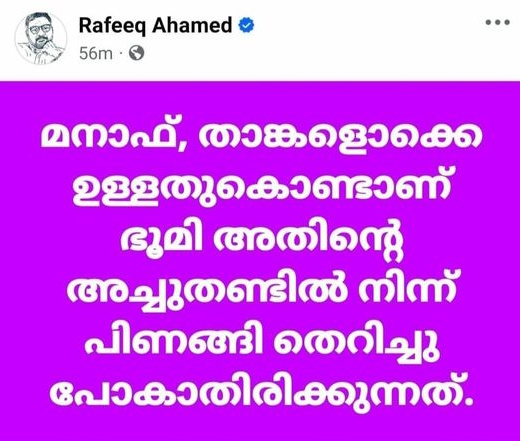 തങ്ങളുടേതല്ലാത്ത കാരണങ്ങളാൽ മനുഷ്യരായി ഭൂമിയിൽ ജനിക്കുന്ന മനുഷ്യരോടു് മാക്രിസ്റ്റായി മനുഷ്യരാകാൻ ആഹ്വാനം ചെയ്യുന്നവരും, കെ-പാർട്ടി മൂഞ്ചിനേതാക്കളുടെ സിംഹാസന സംരക്ഷണത്തിനായി അവരാൽ വിഭാവനം ചെയ്യപ്പെട്ട “പൊളിറ്റിക്കൽ കറക്റ്റ്നെസ്സിനു്” കണ്ടമാനമായ വിലകല്പിക്കുന്നവരുമായ കഞ്ഞികുടി കവികൾക്കു് എന്റെ ഇടതു് നടുവിരൽ ഉയർത്തിയുള്ള വിപ്ലവാഭിവാദ്യങ്ങൾ!!
