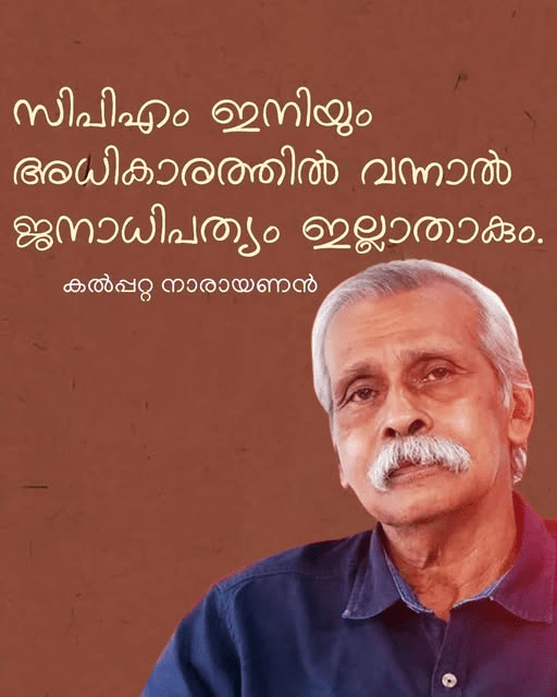 “ഇലക്ഷനടുത്ത ഈ ദിവസങ്ങളിൽ ബഹു. പിണറായി വിജയൻ സഹാവിനോടൊപ്പം പ്രചാരണത്തിനു് പോകുന്ന അടിമക്കണ്ണുകളായ അന്തം കമ്മികൾ ഒരു ആനച്ചങ്ങലയോ, ചുരുങ്ങിയ പക്ഷം ഒരു പട്ടിത്തുടലോ കൈവശം കരുതാൻ മറക്കണ്ട! അപ്രതീക്ഷിതമായ നേരത്തും, നിർവചിക്കാനാവാത്ത രീതിയിലും ‘socially dangerous’ ആയ പിരിവെട്ടും ഇളക്കവും സംഭവിക്കാം! അധികാരനഷ്ടം ‘anticipate’ ചെയ്യുന്ന, ‘pathological liar’ ആയ ഒരു സ്വേച്ഛാധിപതിയിൽ നിന്നും അതുപോലുള്ള ‘kneejerk reaction’ പ്രതീക്ഷിക്കേണ്ടതുണ്ടു്.”