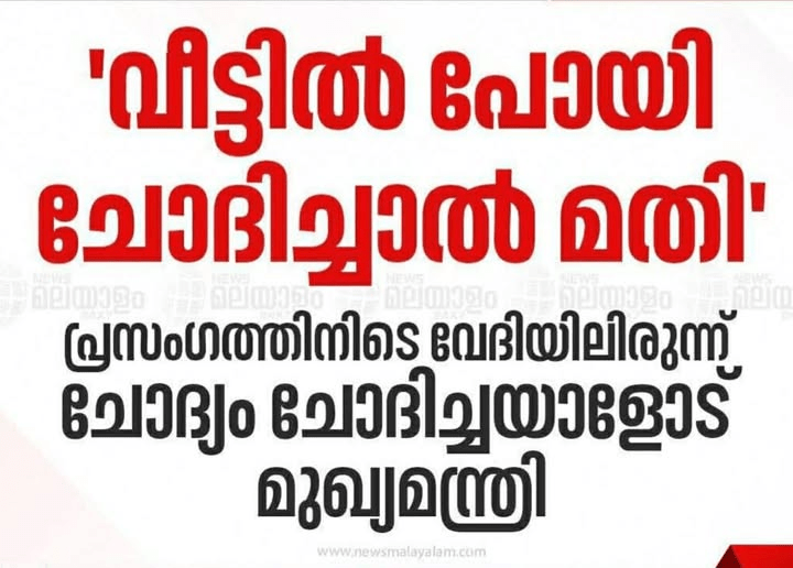 “ഇയാൾക്കു് വേറെന്തോ സൂക്കേടാണു് കേട്ടോ (പക്ഷേ, കെ-റെയിൽ വരും കേട്ടോ)! SDPI യെക്കുറിച്ചു് ഞാനാണോ മറുപടി പറയേണ്ടതു്? അതു് SDPI ക്കാരോടു് പോയി ചോദിക്കു്!!” – പത്രക്കാരോടു് “സന്യാസി സമാനം” ക്ഷുഭിതനായി ബഹു. മു. മ. & ആ. മ. പി. വി. സഹാവു്.