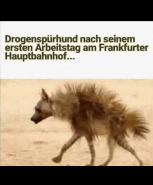“മയക്കുമരുന്നു് മണത്തറിയുന്ന നായ, ഫ്രാങ്ക്ഫർട്ട് സെൻട്രൽ റെയിൽവേ സ്റ്റേഷനിലെ തൻ്റെ ആദ്യത്തെ ജോലിദിവസത്തിനു് ശേഷം!”🙂